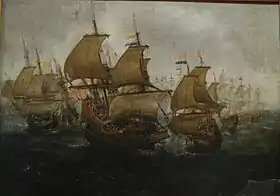 Toledo was slightly wounded by a splinter, but recovered. He went on to further successes in a long career, the climax of which was the naval expedition to Brazil which recaptured Bahia from the Dutch. In the Spanish court, much was made of the event, and Philip IV rewarded those who had most distinguished themselves in combat with grants and pensions. Toledo was given the rank of captain general of Portugal.[11][3][14] The painter Enrique Jácome y Brocas was commissioned to produce a series of paintings illustrating the different phases of the battle, the first of which is currently held in the Naval Museum of Madrid.[3] The Dutch Admiralty of Amsterdam commissioned Abraham de Verwer to produce a commemorative painting.