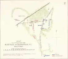 General McClellan claimed that Hanover Court House was yet another "glorious victory over superior numbers" and judged that it was "one of the handsomest things of the war."[8] However, the reality of the outcome was that superior (Union) numbers won the day in a disorganized fight that was characterized by misjudgments on both sides. The right flank of the Union Army remained secure although technically, the Confederates at Peake's Crossing had not intended to threaten it. Also, McDowell's Corps did not need its roads kept clear because it never arrived; the defeat of Union forces at the First Battle of Winchester by Stonewall Jackson in the Shenandoah Valley caused the Lincoln administration to recall McDowell to Fredericksburg. The estimates of Union casualties vary, from 355 (62 killed, 233 wounded, 70 captured) to 397. The Confederates left 200 dead and wounded on the field and 730 were captured by Porter's cavalry.[9]