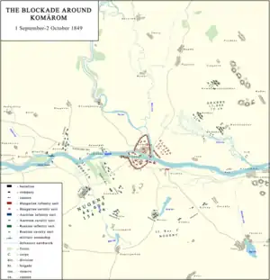 Colloredo's division took up a position at Csallóközaranyos in the Csallóköz and with its outposts occupied Szentpál, Örsújfalu (today both are parts of Komárno), and Nemesőrs, then Keszegfalva and Vízvár.[6] The connection with the right bank of the Danube was assured at Pusztalovad by the “Ceres” steamship, and at Nagylél (today part of Csallóközaranyos), a pontoon bridge was about to be constructed.[6] From Nobili's division, the Teuchert brigade occupied Ács and the Ács forest, while the Lederer brigade Herkály farm (Puszta-Herkály).[6] The Jablonowski brigade was at Pusztacsém (Csém farm); the Chizzola division at Grebic and Billeg; the Jablonski brigade at Mocsa, while the Barco cavalry brigade was camped at Ács.[6] The Russian detachment under Lieutenant General Pavel Grabbe took up positions at Hetény, Kurtakeszi, and Komáromszentpéter.[6] The besiegers started to rebuild their trenches and earthworks from the Ács forest, Csém, Herkály and Csallóköz, which were destroyed by the Hungarians after they managed to relieve the fortress in the Battle of Komárom from 26 April 1849.[6]