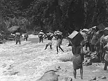 Throughout the night, in front of their position on John's Knoll, the Australians had detected the movement of the Japanese force, and in the early morning a patrol was sent out. In the morning haze, the two groups briefly clashed, and then the Japanese artillery pieces and machine guns opened up. Two companies, equaling roughly 200 men, attacked the position in the first wave under the cover of heavy mortar fire. The main assault fell on John's Ridge, which was being held by an understrength platoon, commanded by Lieutenant Bob Johns. Assisted by clear fields of fire and the defensive qualities of their position, the Australian platoon was able to hold off the first assault and fighting continued throughout the day, with several attacks going in, before the Japanese assault was pushed back.[8] At the height of the assault, the Australian brigade commander – Dougherty – approved a withdrawal, but the 2/27th's commanding officer, Bishop, determined that a counter-attack might restore the situation. Amidst heavy rain, the Australians counter-attacked with two platoons hitting the Japanese flanks.[5] This allowed reinforcements to be pushed through to John's Knoll in the early evening.[11] With ammunition running dangerously low for the Australian defenders, supplies were hurriedly pushed forward during the early morning, being brought up by native carriers across the Faria River. Casualties for the Australians amounted to seven killed and 28 wounded, while Japanese losses were 200 killed.[8]