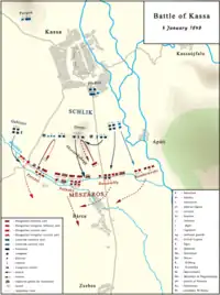 Having defeated the encircling troops, Schlik was thus able to turn almost all his strength against the Hungarian corps.[8] On 4 January, Mészáros could only rely on the main forces advancing from Miskolc (about 8,400 men, 25 guns), but he still outnumbered Schlik's forces concentrated at Kassa (about 6–7,000 men, 22 guns).[1]