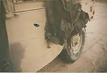 An additional Iraqi column crossed the Saudi Arabian border to the East, although still along the coast, towards the city of Khafji.[72] These Iraqi tanks were screened by the 5th Mechanized Battalion of the 2nd Saudi Arabian National Guard Brigade. This battalion withdrew when it came under heavy fire, as it had been ordered to not engage the Iraqi column. Elements of the 8th and 10th Saudi Arabian National Guard Brigades also conducted similar screening operations. Due to the order to not engage, the road to Khafji was left open.[73] At one point, Iraqi T-55s of another column rolled up to the Saudi Arabian border, signaling that they intended to surrender. As they were approached by Saudi Arabian troops, they reversed their turrets and opened fire. This prompted air support from a nearby AC-130, destroying 13 vehicles.[74]