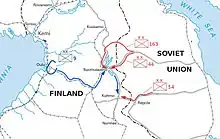 By conquering Northern Finland, the Soviet leadership wanted to occupy the entire Finnish state and cut off the traffic routes to its neighbors during the war.[1] In order to support the advance of the 163rd Rifle Division and 44th Motorized Rifle Division on Oulu, the 54th Rifle Division was to advance south to cut off any routes for reinforcements from the Finnish heartland.[2]