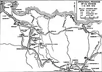 Before the execution of Kin'ichi's plan, other elements of the Nasu Detachment (mainly the 16th Infantry Regiment) began arriving in Leuwiliang and reinforcing the Japanese position.[20] That afternoon as well, the American batteries began firing at the rear of the Japanese vehicle column. After the initial surprise, the Japanese countered with their mortars and own artillery, causing some Australian casualties.[21] As the night came, Nasu overrode Kin'ichi's plan to employ his regiment for the night raid, substituting the 16th regiment instead—as he judged that Kin'ichi's regiment had taken a significant amount of fighting after their landing. The 16th regiment's commander then ordered its 3rd battalion to make a crossing of the Tjianten three kilometers south of the bridge, supported by an artillery company and with the 2nd battalion as a reserve. The 3rd battalion's advance units crossed the river first, and the rest of the battalion arrived at the crossing point sometime after midnight. Due to the river being swollen by a squall, by 5:30 a.m. only two companies had largely managed to cross.[22] The Australians had managed to spot the southerly movement of the Japanese units during the night due to lights from their trucks.[21]