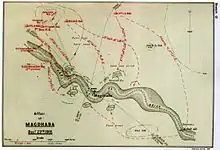 After their retreat from El Arish, the Ottoman garrison withdrew down the Wadi el Arish 25 miles (40 km) south east of El Arish, to Magdhaba and Abu Aweigila, about another 15 miles (24 km) further away from the coast, on the banks of the wadi.[32] At Magdhaba the garrison had increased from 500 to about 1,400 Ottoman soldiers; there may have been as many as 2,000, consisting of two battalions of the 80th Infantry Regiment (27th Ottoman Infantry Division but attached to the 3rd Ottoman Infantry Division for most of 1916). These two battalions, the 2nd Battalion, commanded by Izzet Bey, of about 600 men and the 3rd Battalion, commanded by Rushti Bey, were supported by a dismounted camel company and two squads from the 80th Machine Gun Company. (The remainder squads of the 80th Machine Gun Company had been moved north to Shellal.) The defending force was also supported by a battery of four Krupp 7.5 cm Gebirgskanone M 1873 guns (on loan from the 1st Mountain Regiment), since the 80th Regiment's own artillery battery was stationed at Nekhl. Also attached to the Ottoman garrison at Magdhaba were a number of support units, including elements of the 3rd Company of the 8th Engineer Battalion, 27th Medical Company, 43rd Mobile Hospital and the 46th Cooking Unit. The garrison was under the command of Kadri Bey, the commanding officer of the 80th Infantry Regiment.[37][38]