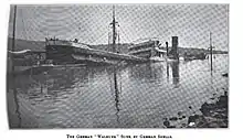 By the time Spee withdrew his ships, large portions of the town had been destroyed. Two entire blocks of Papeete had burnt to the ground before the fires were finally put out. A copra store, a market, and several other buildings and residences were among those destroyed by the shellfire and resulting inferno. While the majority of Papeete's civilians fled to the interior of the island as soon as the fighting began, a Japanese civilian and a Polynesian boy were both killed by German shellfire. Although the two French vessels in the harbor had been sunk, there were no military casualties on either side and the German vessels took no damage. Overall, the bombardment was estimated in 1915 to have caused over 2 million francs' worth of property damage, some of which was recouped through the seizure of a German store on the island.[4] In addition to the seizure of their property, several local Germans were interned and forced to repair the damage Spee's squadron had caused. Perhaps the most lasting effect of the bombardment on the French was the dramatic fall of copra prices in the region, as local suppliers had previously sold a majority of their produce to German merchants in the area who were now interned.[17] Further havoc and distress spread throughout the island 18 days after Spee's squadron had left when rumors started to spread that a second German bombardment was about to begin.[4]
