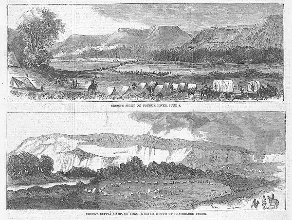 On June 9, 1876, soldiers and civilians under the command of Brigadier General George R. Crook, were encamped on the Tongue River at the mouth of Prairie Dog Creek. With Crook, were over 950 United States cavalry and infantry soldiers, and about 100 civilians. While the soldiers were in camp on June 9, some observed two mounted Cheyenne warriors riding along the bluffs on the north bank of the Tongue River. Then, about 200 concealed Cheyenne warriors suddenly fired a volley of .44 Henry, and .50 caliber rifles from the bluffs into Crook's camp. Another small band of warriors had remained hidden to the east of Crook's camp, with the intention of stealing the soldiers' horses when their attention was diverted. Crook ordered an attack. Companies C, G, and H, of the 9th U.S. Infantry crossed the river, and after wading through the rivers' frigid water, scaled the nearly vertical bluffs. Companies A, E, I, and M of the Third U.S. Cavalry, the battalion under the command of Captain Anson Mills also responded, and crossed the river just to the west, and on the left flank of the infantrymen. Accompanying the cavalry was the newspaper reporter John F. Finerty, the "Fighting Irish Pencil Pusher" for the Chicago Times. After reaching a grove of cottonwood trees, the cavalry dismounted. Leaving every fourth man as a horse holder, the cavalrymen advanced dismounted up the bluffs. After reaching the top, the soldiers drove back the Cheyenne warriors who had fired into the camp earlier, north about half a mile, away from the crest of the ridge. But at a second ridge line, the Cheyenne's reformed. Soldiers then drove them from it, crossing into Montana Territory. Warriors reformed a third time, but this final effort lasted only briefly, and the Cheyenne warriors retreated north. The warriors intending to steal the soldiers' horses did not attempt to do so, the horses being closely guarded. Thus ended the Battle of Prairie Dog Creek.[1]