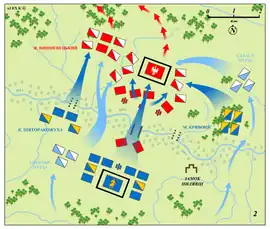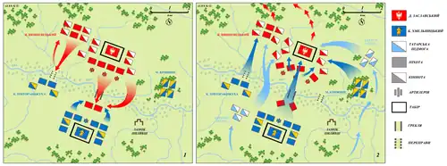 Following several days of minor battles, Khmelnytsky led his army on the morning of 13 September 1648 shouting: “For the faith, brave warriors, for the faith!", killing many Polish cavalrymen as they fled back across the Ikva.[3]: 474 That night, the Polish commanders decided to retreat in corral formation to Starokostiantyniv, but while preparing for this retreat the next day, they would hold their position and fight under Wisniowiecki's command.[3]: 475 However, "rumours began curculating among the troops ... that the commanders had abandoned the camp and taken flight, and fear was turned into wholesale panic".[3]: 475 "Everyone else began to flee, leaving behind wagons, cannon, and all kind of supplies, only the sick and maimed remained", not stopping at Starokostiantyniv, Koniecpolski went to Brody, Ostroróg to Olesko, Zaslawski to Vyshnivets.[3]: 475