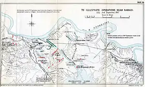 With artillery support, British forces advanced up two ridges to the south of Ramadi in the face of Turkish machine gun, rifle and artillery fire. Both were taken by the early afternoon of 28 September. The garrison's last escape route was now the Aziziya Bridge just to the west of Ramadi and, as the battle continued into the night under bright moonlight, a column of Turkish infantry sought to fight its way out of the trap at 03:00 on 29 September.[14] Heavy British machine gun and artillery fire repelled them and drove the survivors back to Ramadi after an hour and half of fighting.[16] The 39th Garhwal Rifles attacked the bridge, charging Turkish guns firing over open sights, and took it by 07:30 despite suffering heavy casualties; only 100 men from the three assaulting companies made it through.[17]
