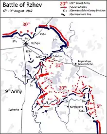 The Battle of Rzhev in the summer of 1942 was part of a series of battles that lasted 15 months in the center of the Eastern Front. It is known in Soviet history of World War II as the first Rzhev–Sychyovka offensive operation, which was defined as spanning from 30 July to 23 August 1942. However, it is widely documented that the fighting continued undiminished into September and did not finally cease until the beginning of October 1942.[5] The Red Army suffered massive casualties for little gain during the fighting,[6] giving the battle a notoriety reflected in its sobriquet: "The Rzhev Meat Grinder".