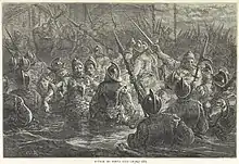 On the morning of 16 June, Cumberland disembarked 700 men at Cangrejos Bay twelve miles east of San Juan, then marched until nightfall.[5] However one mile short of the city he and his men came up to a bridge known as San Antonio, the only land access to the San Juan islet. This was held by around 100 Spanish soldiers.[5] They managed to repel the English assault, inflicting forty casualties on them,[5] while the Earl of Cumberland himself almost drowned trying to cross the San Antonio channel.[6] The Spaniards suffered only four casualties.[5] The next morning, the English used their boats to outflank the Spanish position, disembarking at Escambrón Point while bombarding Boquerón Redoubt (called Red Fort by the English).[5] The fort was bombarded into submission and the guns silenced with ease as the English deliberately grounded one of their ships in front of the fort which enabled point blank precision firing; by the evening most of the defenders had retreated.[7] The English took possession of the area and consolidated while the rest of the force arrived; two Spanish vessels found were captured.