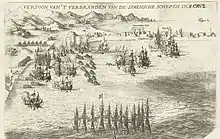 Blake kept the fleet at sea throughout an entire winter in order to maintain the blockade. During this period a Spanish convoy was destroyed by one of Blake's captains, Richard Stayner.[15] A further six ships were sent from England as reinforcements towards the end of 1656, including George, which became Blake's flagship. In February 1657, Blake received intelligence that the convoy from Mexico was on its way across the Atlantic. Although his captains wanted to search for the Spanish galleons immediately, Blake refused to divide his forces and waited until victualling ships from England arrived to re-provision his fleet at the end of March. After this Blake (with only two ships to watch Cadiz), sailed from Cadiz Bay on 13 April 1657 to attack the plate fleet, which had docked at Santa Cruz de Tenerife in the Canary Islands to await an escort to Spain.[16]