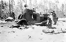 Destroyed Soviet armoured car is inspected by Finnish officers. SA-kuvat