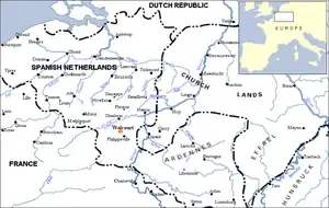 Administrative problems and the late arrival of contingents delayed the opening of the Allied offensive in the region until late June. Waldeck moved from near Tienen and headed towards Fleurus; the two armies spent the next two months marching and counter-marching in an attempt to gain a strategic advantage.[11] By 24 August Waldeck had crossed the Sambre and had camped near the small ancient town of Walcourt where he was satisfied to live upon enemy territory.[12]