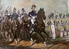 Unable to capture Warsaw by a frontal assault, von Diebitsch devised a plan to outflank it and enter the city from the west.[8] In early 1831 he sent his forces upstream on the Vistula, where the Russian divisions were to cross the river and head back north, towards Warsaw.[8] The new plan was thwarted by the Polish defence in three successive battles around Wawer, Dębe Wielkie and Iganie.[8] The Russians withdrew towards Siedlce,[8] where von Diebitsch fell ill and died of cholera.[9][note 2]