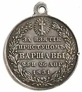 The battle of Warsaw (Polish: Bitwa pod Warszawą, Russian: Варшавская битва), also known as the battle and storming of Warsaw,[1] was fought in September 1831 between Imperial Russia and Poland. After a two-day assault on the city's western fortifications, the Polish defences collapsed and the city was evacuated. It was the largest battle and the final episode of the Polish–Russian War of 1830–31, a conflict that became better known as the November Uprising.