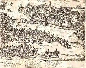 After plundering Vest Recklinghausen, on 1 March Schenck captured Werl through trickery. He loaded a train of wagons with his soldiers and covered them with salt, a valuable commodity. When the wagons of salt were seen outside the city, the guards opened the gates and they were admitted at once. The "salted soldiers" then over-powered the guards and captured the town.[3] Some of the defenders escaped to the Werl citadel. Schenck and his troops stormed it several times, but were turned away. When they could not capture the well-fortified citadel, they thoroughly sacked the city, theoretically to discourage any citizens from helping the guards in the citadel.[4]