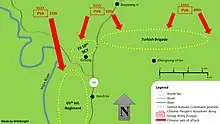 The assault began at 20:00 on 22 April when the enemy hit the Turkish Brigade with an artillery barrage. Shortly after midnight, an artillery and mortar barrage followed by intense small-arms and machine gun fire struck the entire 3rd Division line.[12] While the Turkish Brigade were engaged in fierce battle, the 10th BCT, deployed in the Yultong area on the left of the Turkish Brigade, from 23:00 was assaulted in waves by the PVA and fought a series of close combat engagements within its positions.[4] Communication with the 65th Regiment was disconnected by enemy artillery and some friendly fire support[4] but was restored at 00:30.[9] Around midnight, the Turkish Brigade were ordered to withdraw to a position on the Line Kansas south of the Hantan River.[4] The 65th Regiment's 2nd Battalion was forced to fall back several hundred yards to regroup due to the intensity of the PVA attack.[12]