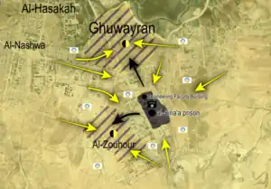 - ↑ "Seeking putting an end to ISIS riot : Coalition brings military convoy to the vicinity of Ghuwayran prison, and death toll tops 90". Syrian Observatory for Human Rights.