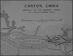 The Battle of the Barrier Forts (also known as the Battle of the Pearl River Forts) was fought between American and Chinese forces in the Pearl River, Guangdong, China in November 1856 during the Second Opium War. The United States Navy launched an amphibious assault against a series of four forts known as the Barrier Forts near the city of Canton (modern-day Guangzhou). It was considered an important battle by the British whose interest lay in capturing Canton.