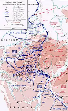 Map showing the swelling of "the Bulge" as the German offensive progressed creating the nose-like salient during 16–25 December 1944.