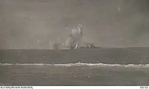 ![]() Bombs from a Japanese aircraft falling near the Dutch light cruiser Java in the Gaspar Strait east of Sumatra, Dutch East Indies, on 15 February 1942. | |||||||