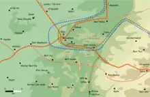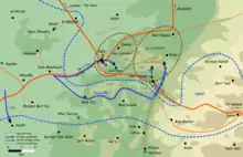 On the night of 15–16 July, several companies of the Harel brigade laid on an assault against Latrun by the east, around the "artillery ridge" and the villages of Yalo and Bayt Nuba. They carried on to the hills by way of the villages of Bayt Thul and Nitaf transporting their armoury using pack mules. After several hours of fighting and counter-attacks by armoured vehicles of the Arab Legion, they were finally pushed back but could keep control of several hills.[50][51][52] In total, the Israelis lost 23 dead and numerous injured.[53]