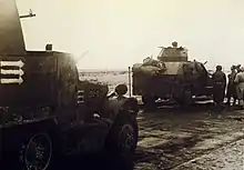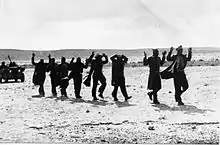 The Israeli task force set out into the Sinai at 14:00 on December 28.[8] This was the first time that many of the soldiers, including Yitzhak Rabin, visited another country. The force consisted, in the order of movement, of the Negev Brigade's 9th Battalion and staff, the 82nd Battalion of the 8th Brigade, and the Negev's 7th Infantry Battalion. Israeli aircraft mistakenly attacked them, killing one soldier and injuring another, until a flag resembling the Israeli (a military flag from the Jewish Brigade) was flown.[7]
