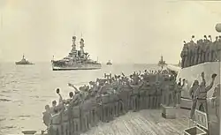 From the beginning, the battleships of Division Nine faced a hard task in adapting to the new methods and practices they encountered in the Grand Fleet. Any difficulties, however, that might have arisen from this transition based on national pride or rivalry were dissipated in large part by the professional example set by Admiral Rodman himself. As he would later note of his squadron's assimilation: "I realized that the British fleet had had three years of actual warfare and knew the game from the ground floor up; that while we might know it theoretically, there would be a great deal to learn practically. There could not be two independent commands in one force if our work was to be harmonious, and the only logical course was to amalgamate our ships and serve under the command of the British commander-in-chief."[20] This cooperative attitude trickled down through the division, and elicited the admiration and appreciation of the British.[21][22][23]