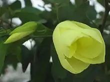 Yellow bauhinia is a small tree with a maximum height of 4 m (13 ft).[4] It has drooping slender branches with multiple scrambling stems. The bark is greyish, smooth, and sometimes hairy, which gives its specific name tomentosa. Greenish leaves are deeply divided and elliptic in nature; margin entire. Flowers are bell-shaped with large, yellow petals with a dark maroon patch at the base. The fruit is a pale-brown pod.[5] Extracts of the plant's roots have in vitro antimicrobial activity against Gram-positive bacteria.[6][7]