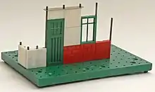 Bayko was primarily intended for the construction of model buildings. The rectangular Bakelite bases had a square grid of holes, spaced at 3/8 inch centres, into which thin metal rods, 75 thou [1.905 mm] in diameter, of various lengths, could be placed vertically. In order to make larger models, two or more bases could be joined together by means of metal links secured by screws through holes in the bases. Bakelite bricks, windows and other parts could then be slotted between pairs of rods in order to create the walls of the building. Other commonly used parts included floors (thin sheets of resin bonded paper with the same square pattern grid of holes as bases), and roofs of various types. There were also a large number of other more specialised parts.[4] In the original sets bases were large, and coloured brown; walls were brown/maroon and cream; roofs were deep maroon; and windows were a very dark green, but by 1937 the 'true' colours of red or white walls, green windows and red roofs were established, though bases were still large and brown.