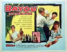 Bayou is a 1957 American drama film directed by Harold Daniels and starring Peter Graves, Lita Milan and Douglas Fowley. The drama is set in the Louisiana bayou region. Produced by American National Films, it was also shot in Barataria Bay, Louisiana, and most of the characters are Cajun residents of a rural fishing village. Bayou features one of the few lead roles by noted character actor Timothy Carey.