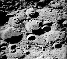 ![]() Oblique view of Bečvář from Apollo 17, facing north. Bečvář X is at top near center, Bečvář Q is below left of center, and Bečvář J is partially visible in lower right. | |