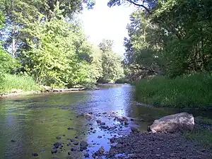 Bear Creek is the name of a stream located entirely within Jackson County, Oregon. The stream drains approximately 400 square miles (1,000 km2) of the Rogue Valley and discharges an annual average of 114 cubic feet per second (3.2 m3/s) into the Rogue River. It begins near Emigrant Lake and travels 28.8 miles (46.3 km) through the municipalities of Ashland, Talent, Phoenix, Medford, and Central Point.[4]