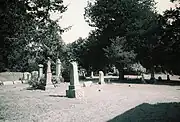 The church continued to grow through the remainder of the 19th century. However membership began to decline in the early 1900s until finally the last regularly scheduled services were held there on February 7, 1914.[2] In October, 1946 a group from the First Baptist Church of Kirksville dedicated a large boulder with plaque on the site in honor of its status as the first church in the county. The cemetery continued in use long after the church had ceased regular services, the last known burials being in 1979. Among the local notables buried in the Bear Creek cemetery is Samuel Withrow, the first postmaster in Adair County, buried there in 1852.[5] In May, 1982 a non-profit corporation, the aforementioned Bear Creek Cemetery Association of Adair County, was established to care for the property and building.[2] Among their first projects was to secure the site's placement on the National Register of Historic Places. The Bear Creek Church survived a close call with Mother Nature in 2009. On May 13 of that year a tornado estimated as an EF2 on the Enhanced Fujita Scale passed near the church as it left a path of death and destruction from Novinger to Kirksville. Two Adair County residents were killed by the tornado about one mile from the church.[6]