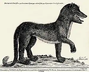 Despite the widely held interpretation based on most of the historical research that the beast was a wolf[56][57] or another wild canid, several alternative theories have been proposed; some think a lion (namely a subadult male) escaped from a menagerie, due to the size and some descriptions being more similar to a lion than a wolf. Others consider an escaped striped hyena, due to some sketches of the beast describing it as such. Another theory is that a large feral dog or wolfdog was responsible, since some sightings were of an animal that looked similar to a wolf, but was not one.[58][59] In a 2021 talk by François-Louis Pelissier, based on the described appearance of the animal and specific details of behaviour and what can be inferred about historical distribution, he argued that beast encounters could most likely be blamed on the Italian wolf Canis lupus italicus.[60]