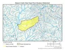 Beaver Creek rises in a pond on the Crabtree Creek divide in Apex in Wake County, North Carolina. Beaver Creek then flows west to meet New Hope River in the B. Everett Jordan Lake Reservoir in Chatham County.[2]