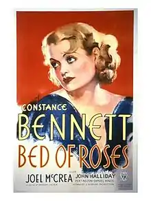 Bed of Roses (1933) is a pre-Code romantic comedy film co-written and directed by Gregory La Cava and starring Constance Bennett.[4] The picture was released by RKO Radio Pictures with a supporting cast featuring Joel McCrea and Pert Kelton.
