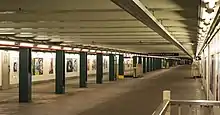 Both outer track walls have a light green trim line with a dark green border. Below the trim line are small black tile captions at regular intervals that alternate between "BEDFORD" and "NOSTRAND" in white lettering. The tiles were part of a color-coded tile system used throughout the IND.[6] The tile colors were designed to facilitate navigation for travelers going away from Lower Manhattan. Because the Crosstown Line does not merge into a line that enters Manhattan at either end, all stations on the line had green tiles.[7][8] Both platforms have green I-beam columns (formerly painted red) running along them at regular intervals, alternating ones having the standard black station name plate in white lettering.