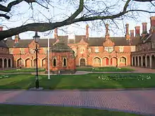 Among the most notable buildings in Bedworth are the Nicholas Chamberlaine Almshouses on All Saints' Square in the town centre, which are built in Tudor style and date from 1840,[8] These replaced the original buildings which had been funded by a legacy from the local benefactor Nicholas Chamberlaine (1632–1715) through his will. The almshouses were restored in the 1980s, and are now Grade II* listed.[16][17]