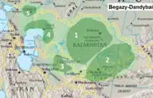 Begazy-Dandybai culture is a late Bronze Age culture of mixed economy in the territory of ancient central Kazakhstan, Kyrgyzstan, and Uzbekistan, centered at Saryarka region. The culture, with its megalithic mausolea dates from c. 1350-1150 BCE,[1] but was previously dated between the 12th and 8th centuries BCE,[2] or from 13th to 10th centuries BCE.[3][4] The culture was discovered, first excavated, and published in the 1930s-1940s by M.P. Gryaznov, who took it for a local version of Karasuk culture. In 1979 the Begazy-Dandybai culture was described and analyzed in detail in a monograph by A.Kh. Margulan, who systematically reviewed accumulated material and produced description of the archeological culture.[5] The most famous monuments of Begazy-Dandybai culture are Begazy, Dandybai, Aksu Ayuly 2, Akkoytas, and Sangria 1.3, it was named after the first two archeological sites.