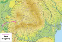 The Bega or Begej (Romanian: Bega; Serbian: Бегеј / Begej; German: Bega; Hungarian: Béga, formerly Kistemes), is a 244 km (152 mile) long river in Romania (169 km; 105 mi.) and Serbia (75 km; 47 mi.).[1][4][5] It rises in the Poiana Ruscă Mountains in Romania, part of the Carpathian Mountains, and it flows into the Tisa river near Titel, Vojvodina, Serbia. Its drainage basin covers an area of 4,458 km2 (1,721 sq mi),[6]: 22 of which 2,362 km2 (912 sq mi) in Romania.[7][5]