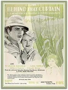 Behind That Curtain is a 1929 American Pre-Code mystery film directed by Irving Cummings and starring Warner Baxter, Lois Moran and Gilbert Emery.[1] It was the first Charlie Chan film to be made at Fox Studios. It was based on the 1928 novel of the same name. Charlie Chan, who is played by Korean-American actor E. L. Park, gets one mention early in the film, then makes a few momentary appearances after 75 minutes. Producer William Fox chose this film to open the palatial Fox Theatre in San Francisco on June 28, 1929. It was a sound film.