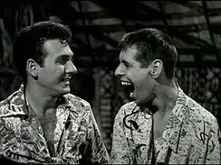 According to Cohen, Jerry Lewis was furious when he heard that Petrillo and Mitchell had formed a team that was imitative of his act with Dean Martin, and that they were to appear in a film together. Gary Lewis, Jerry's eldest son was quoted, "When Sammy and the other guy played in that gorilla movie, I remember my dad and Dean saying, ‘We got to sue these guys — this is no good.’"[3] Lewis, who knew Jack Broder through the Friars Club of Beverly Hills, showed up at Broder's office. The two got into a screaming match over the film and Lewis stormed out yelling obscenities.[6] Paramount Pictures producer Hal B. Wallis, who then had Martin and Lewis under contract and also knew Broder through the Friars Club, threatened to sue Broder for releasing a film that featured a duo that closely resembled Martin and Lewis.[7] Wallis and Broder had a meeting after shooting wrapped. According to Cohen, Broder offered to sell Hal Wallis the film's negative for a substantial amount of money. Wallis agreed to buy it so he could destroy it before anyone could see it. However, Broder and Wallis could not agree on a price. Broder released the film and Wallis never spoke to Broder again.[8]
