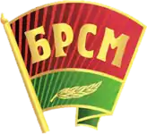 The BRSM has two official symbols: an emblem and a flag.[6] The emblem, which is based on the Komsomol badge and modeled on the Belarusian national flag, has a red bar bearing the initials of the BRSM, written in gold in Cyrillic, over a green bar bearing a golden olive branch.