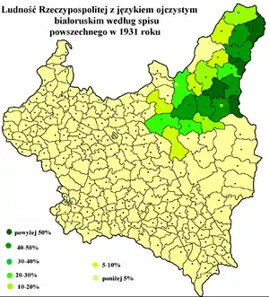 In 1921, at the end of the Polish–Soviet War, Belarusian territories were divided between Second Polish Republic and Soviet Russia under the terms of the Peace of Riga. Thus the newly reborn Poland gained a disputed territory, known as Kresy or West Belarus, inhabited by both Belarusians and Poles. According to the Polish census of 1921, there were around 1 million Belarusians in the country. According to Soviet sources, there were 3 million Belarusians in 1921.[3] Most historians estimate the number of Belarusians in Poland at that time to be from 1.7 million[4] up to 2 million.[5] Belarusians formed 3.1% of the populations of the Second Polish Republic, mostly inhabiting the east-central voivodeships, particularly the Nowogródek Voivodeship.[6][7] Belarusians consisted the majority of population of Polesie Voivodship, however most of them didn't declare themselves as Belarusians, but at Tutejsi ("Locals").