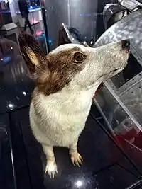 Strelka went on to have six puppies with a male dog named Pushok who participated in many ground-based space experiments, but never made it into space.[4] One of the puppies was named Pushinka (Пушинка, "Fluffy") and was presented to President John F. Kennedy by Nikita Khrushchev in 1961. A Kennedy dog named Charlie and Pushinka mated, resulting in the birth of four puppies that JFK referred to jokingly as pupniks.[5] Two of their puppies, Butterfly and Streaker, were given away to children in the Midwest. The other two puppies, White Tips and Blackie, stayed at the Kennedy home on Squaw Island but were eventually given away to family friends.[4] Pushinka's descendants were still living as of 2015.[6] A photo of descendants of some of the Space Dogs is on display at the Zvezda Museum in Tomilino outside Moscow.[7]