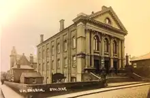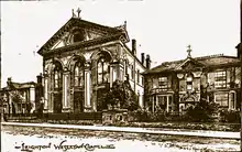 - Leighton Buzzard, Corn Exchange, Lake Road, 1862. According to Pevsner; "Victorian at its most irresponsible. Gay and vulgar, with two two-storeyed middle porch adorned with atlantes and caryatids. The style is a kind of dissolute Renaissance".[41] The Illustrated London News of 23 May 1863 described the Exchange as "a very handsome stone structure, situated in a commanding position, at one end of the market-place, with a good frontage. The Exchange-hall is spacious, and decorated with Ionic pilasters, cornice, and recessed, arched windows at the sides; the ceiling is formed into sunk coffers by enriched stiles, supported by coved ribs...... The design throughout is chaste and original, the front being designed in the modern Italian style of architecture, and consists of two stories of three light Venetian windows." The cost of site and buildings was about £7500. It later was used as a cinema, and in 1932 the spire above the portico became unsafe and was taken down.[42] The Exchange was demolished c.1960.