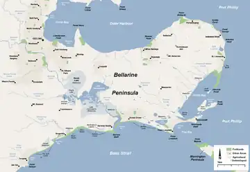 The Bellarine Peninsula (Wadawurrung: Balla-wein or Biteyong)[1] is a peninsula located south-west of Melbourne in Victoria, Australia, surrounded by Port Phillip, Corio Bay and Bass Strait. The peninsula, together with the Mornington Peninsula, separates Port Phillip Bay from Bass Strait. The peninsula itself was originally occupied by Indigenous Australian clans of the Wadawurrung nation, prior to European settlement in the early 19th century.[2] Early European settlements were initially centred on wheat and grain agriculture, before the area became a popular tourist destination with most visitors arriving by paddle steamer on Port Phillip in the late 19th century.