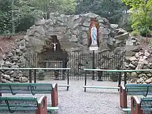 The quad is located between the Poellath and O'Connell residence halls, both constructed in the early 1960s. Raphael Arthur Hall, constructed in 1967, offers students individual rooms and sits on the hill above Poellath, near Campus Police. The St. Joseph's Eucharistic Adoration Chapel, dedicated in 2008, is across from Campus Police. Wheeler Athletic Center, completed in 1970, is located behind Poellath Hall. At the back of the campus are the four Cuthbert Allen Apartment buildings, built in 1989. The newly renovated Student Commons, located next to the new cafeteria, houses the campus mailroom, snack machines, a lounge area, and Student Life offices. Behind the Student Commons are the St. Scholastica and St. Benedict residence halls. The Lourdes Grotto, an official pilgrimage shrine, is situated behind O'Connell Hall.